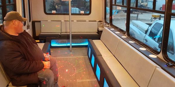 Little guy seats around 15 people. dance pole can be removed if you prefer to not have one. Has higher end two tone interior with under seat lights. Normal rate is $135 an hour. No forced tip.